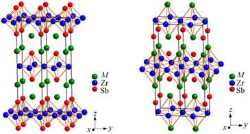 c = 15.870(4) Å for Ce0.114(19)Zr0.886(19)Sb; a = 4.1557(13), c = 15.926(5) Å for Pr0.14(2)Zr0.86(2)Sb; a = 4.1426(11), c = 15.885(4) Å for Nd0.136(18)Zr0.864(18)Sb; a = 4.1323(7), c = 15.842(3) Å for Sm0.104(16)Zr0.896(16)Sb).